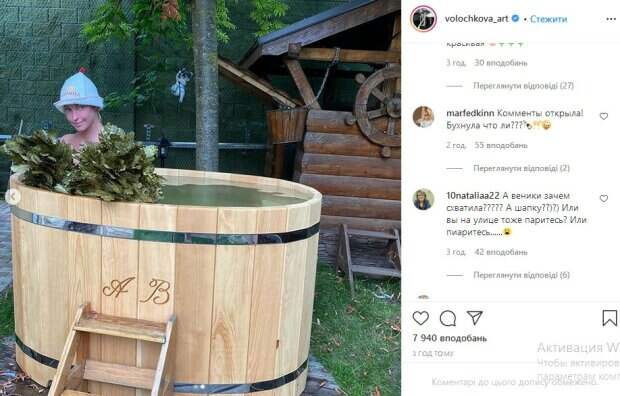 😊😉❤️🔥 А прежняя купель по-прежнему ждёт своего хозяина», — говорится в сообщении. Обратим внимание, что на снимках покрасневшая Волочкова позирует без белья, прикрыв пикантные места банным веником. Это стало причиной бурных комментариев со стороны пользователей сети. «Как нестыдно старой рогаткой сверкать то», «зиновий. Это шыдевр фото*опа 👏снимаю шляпу куколка 😂», «Слава богу без шпагата и без шубы», «Шубу отдала заплатку поставить ?», «А веники зачем схватила????? А шапку??)?) Или вы на улице тоже паритесь? Или пиаритесь.... Комменты открыла! Бухнула что ли?», — пишут они. До этого мы писали, что известная балерина Анастасия Волочкова похвасталась неуместным шпагато. Артистка показала фото, как сидит в шпагате на крыше авто и между двух гиропланов. При этом она закрыла возможность комментировать ее фотографии Напомним, скандальная Волочкова сделала свой фирменный шпагат в компании мужчин. А еще Politeka писала, бесстыжая Волочкова задрала балетную пачку и засветила пикантные места. Также Politeka сообщала, Волочкова сверкнула исхудавшими ногами в шерстяных сапогах.