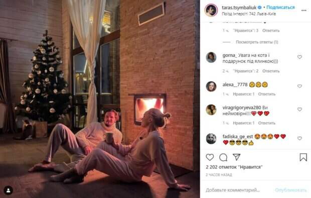 И Тарас, и его возлюбленная позировали в удобной домашней одежде пастельных тонов, расположившись прямо на полу у камина. Рядом с ними стояла новогодняя елочка, под которой сидел котик. Приятное освещение, расслабленные позы и легкие "живые" улыбки сделали этот кадр по-настоящему теплым и атмосферным. "Сижу сейчас в поезде интерсити, следующего из Львова в Киев, вспоминаю замечательный отдых в Карпатах❤️ Цените каждое мгновение, друзья