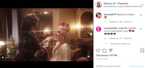 Звезды по очереди загадывают желание, проверяя, сбудется ли оно. Далее Филипп начинает петь свою песню «Романы». Его партнершей по клипу стала популярная модель и певица из Молдовы Наталья Гордиенко. Эффектная блондинка была одета в пикантный халатик с пухом и корону. «Смотрите фильм от @cosmopolitan_russia как звезды «пилят» новогодний контент и мои невероятные #Романы с музой @natalitsa, которая вдохновляет меня на Евровидение 2021», - подписал видео артист. «Какие мы клевые», - написала под постом восторженная Бузова. Под постом артисту оставили массу отзывов, как положительных, так и негативных. «Филипп Бедросович, Вы умеете удивлять», «Спасибо за это новогоднее чудо», «Как красиво сказано! Филипп Бедросович вы прекрасен!», «Романы это хит года», «Рядом с Вами, Филипп Бедросович, случаются такие волшебные вещи, о которых можно только мечтать!», «Фу, такой серьезный мужчина и с Бузовой», - пишут пользователи сети. Напомним, что "коронованный" Киркоров развлекся с детьми возле елки, кадры баловства: "Это шикарно!". Как сообщала Politeka, осунувшийся Киркоров с густой бородой ошеломил неопрятным видом перед свадьбой: "Не сразу поняла, что это Филипп". Также Politeka писала, что Орбакайте и Киркорова подловили вдвоем, пока другие спят: неожиданные кадры взбудоражили сеть.