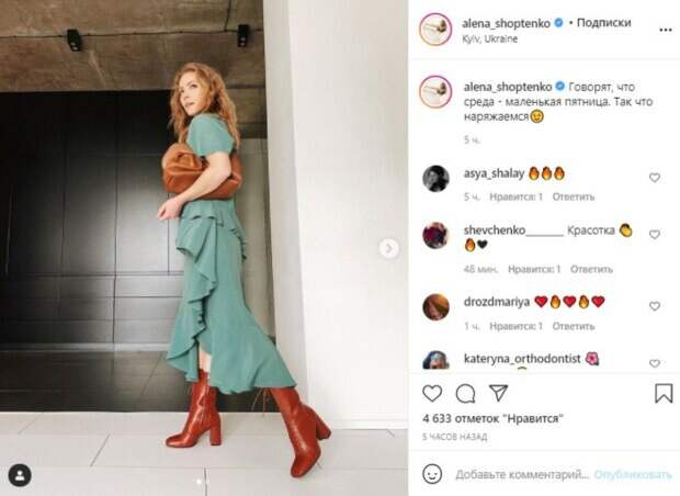 Кокетливый разрез снизу добавил особого шарма. Кожаные сапожки на толстом каблучке и сумочка коричневого оттенка дополнили роскошный лук. Алена сделала "ветреную" укладку и нанесла яркий макияж в персиковых цветах. Девушка игриво стрельнула глазками в камеру и нежно улыбнулась. "Говорят, что среда - маленькая пятница. Так что наряжаемся
