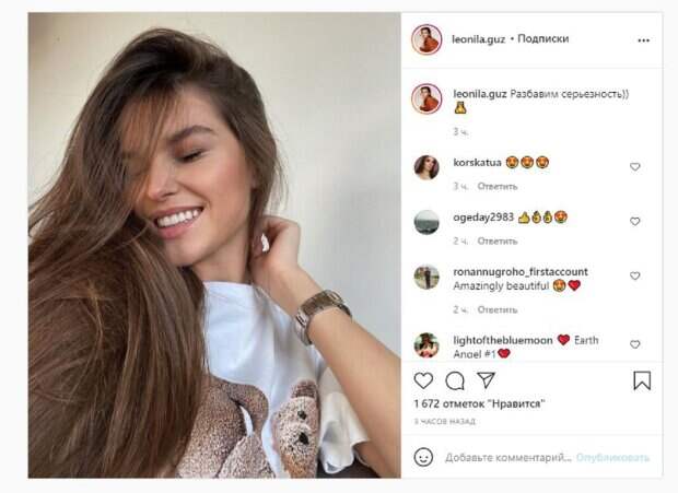 Известная модель Леонила Гузь, "Мисс Украина 2018", показала свежий легкий образ На фото Леонила показалась в футболке с принтом мишек. Гузь решила оставить волосы распущенными, а сама закрыла глаза от удовольствия. Девушка улыбнулась, хвастаясь белоснежной красотой. Образ модель дополнила наручными часами, которые можно увидеть на одной из рук, которую показала в кадре звезда.