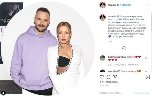 Известная украинская певица Тина Кароль заинтриговала новым фото Как сообщает Politeka.net, звезда, которой приписывают роман с молдавским музыкантом Даном Баланом, находится на пике популярности. Недавно креативный продюсер проектов на канале "1+1" Владимир Завадюк поделился на своей странице в соцсети Instagram инригующим совместным снимком с Тиной Кароль.