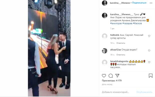 Тот держал в руках микрофон, в который они вместе периодически еще и пели. К слову, неподалеку от парочки вытанцовывал Николай Басков. На других кадрах Лорак уже поет сама - рядом с ней были все те же Лазарев и Басков, а также к ним присоединился муж Аллы Пугачевой юморист Максим Галкин. Артисты отрывались на полную, не обращая внимания на то, что их исподтишка снимают на телефон. Также в сеть попало видео с Лазаревым, который "почти" поцеловался с Лорак, сидя за праздничным столиком. Этот ролик собрал много комментариев: "ХВААХААХХА, ну Каролиин, ну почему ты его не поцеловала