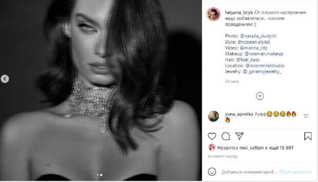 Волосы ей уложили в волнистую укладку, а макияж визажисты выполнили с акцентом на глаза. Фотографии были слегка размыты, однако не утратили своего очарования. На них красотка выглядела чувственной и страстной одновременно. «От плохого настроения надо избавляться... плохим поведением :)», - призналась она. Ее поклонники пришли в восторг из-за опубликованных фотографий. "Уфф", "Прекрасная", "Шикарная", "Таня огонь", - пишут в сети. Отметим, что Татьяна Брык славится пикантными фотографиями и просто своей красивой внешностью. У себя в Инстраграм она раздает поклонникам всевозможными полезные советы по похудению и приведению своего организма в отличную форму. За это ее и любят. Ранее Таня решила показать архивные фото по просьбе своих поклонников в социальной сети Инстаграм. Красотка с удовольствием показала милое детское фото с отцом, с которым в обнимку позировала. Также девушка поделилась кадром, сделанным в 2011 году во время самой первой своей фотосессии. Напомним, что победительница "Супер Топ-модель по-украински" Таня Брык устроила испытание для ягодиц А еще Politeka писала, что победительница "Супер Топ-модель по-украински" Таня Брык показала мастерство на пилоне Также Politeka сообщала, что победительницу "Супер топ-модель по-украински" Таню Брык сравнили с Анджелиной Джоли, смелое фото