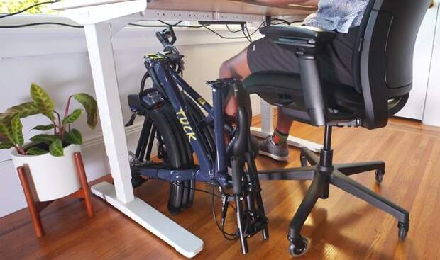 Если байк нужен узким и коротким, раму можно дополнительно сложить посередине, так что переднее и заднее колеса встанут бок о бок. И наконец, чтобы велосипед стал максимально компактным, руль, педали, рама и колеса складываются разом.