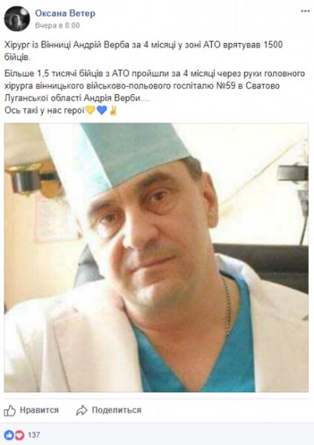 Хирург из Винницы Андрей Верба за четыре месяца спас 1500 бойцов на Донбассе Как передает Politeka.net, о настоящем подвиге медика сообщила украинка на своей страничке в Facebook. "Более 1,5 тыс. бойцов с АТО прошли за четыре месяца через руки главного хирурга винницкого военно-полевого госпиталя №59 в Сватово Луганской области Андрея Вербы.
