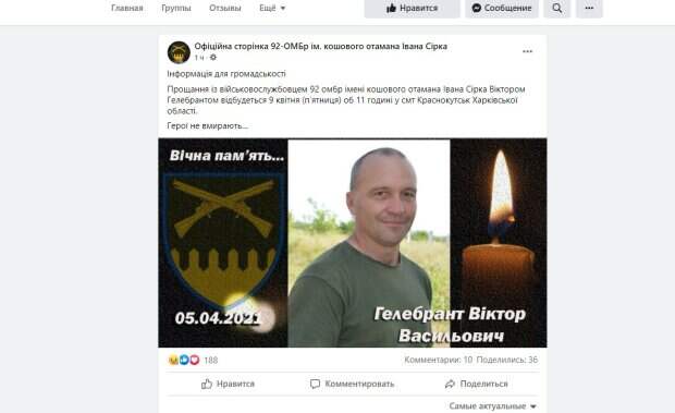На Харьковщине проведут в последний путь бойца ВСУ Прощание с харьковским военнослужащим Виктором Гелебрантом, который погиб на Донбассе, пройдет в Харькове. Младшего сержанта Виктор Гелебранта 5 апреля убили выстрелом в голову из стрелкового оружия. Виктору Васильевичу Гелебранту шел 49-й год. Он был командиром отделения – командиром машины 1-го механизированного взвода 1-й механизированной роты 1-го механизированного батальона 92-й ОМБРр.