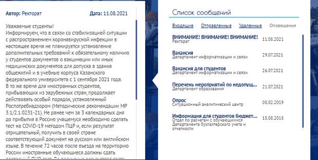 Для иностранных студентов продолжит действовать особый порядок, установленный Роспотребнадзором: не ранее чем за 3 календарных дня до прибытия в Россию необходимо сделать тест на COVID-19. При получении отрицательного результата нужно получить в своей стране соответствующий документ на русском или английском языке. Фото: скриншот / realnoevremya.ru В течение 72 часов после въезда на территорию РФ иностранным студентам необходимо сдать повторный ПЦР-тест. До получения результатов теста им необходимо соблюдать режим самоизоляции по месту проживания. В период изоляции обучение будет проходить в онлайн-формате. Без повторного отрицательного теста иностранных студентов не допустят к очному обучению. В конце июля в распоряжении «Реального времени» оказался приказ, в котором в котором прописано, что все сотрудники и студенты Казанского федерального университета должны вакцинироваться от COVID-19 не позднее 25 августа этого года. Также было объявлено о внедрении пропускного режима в зданиях и учебных корпусах. На входе следовало предоставить следующие данные: результат теста анализа ПЦР на COVID-19 (отрицательный) (сделанного не более чем за 72 часа до посещения помещений КФУ); сертификат о вакцинации (ревакцинации) против новой коронавирусной инфекции (COVID-19); справку врача о медицинском отводе от вакцинации (ревакцинации) против новой коронавирусной инфекции (COVID-19); справку о перенесенном заболевании COVID-19 в течение последних шести месяцев.