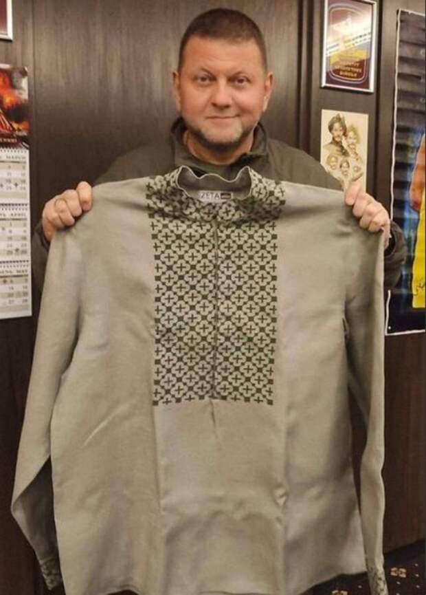 Главнокомандующему Вооруженными силами Украины Валерию Залужному был подарен необычный подарок — «вышиванка смертника» с символом Z. Это произошло на фоне слухов о том, что генерал Залужный был ликвидирован в результате авиаудара ВКС России по командному центру. На фотографии, представленной изданием «Царьград», генерал Залужный позирует с вышиванкой в стиле милитари.