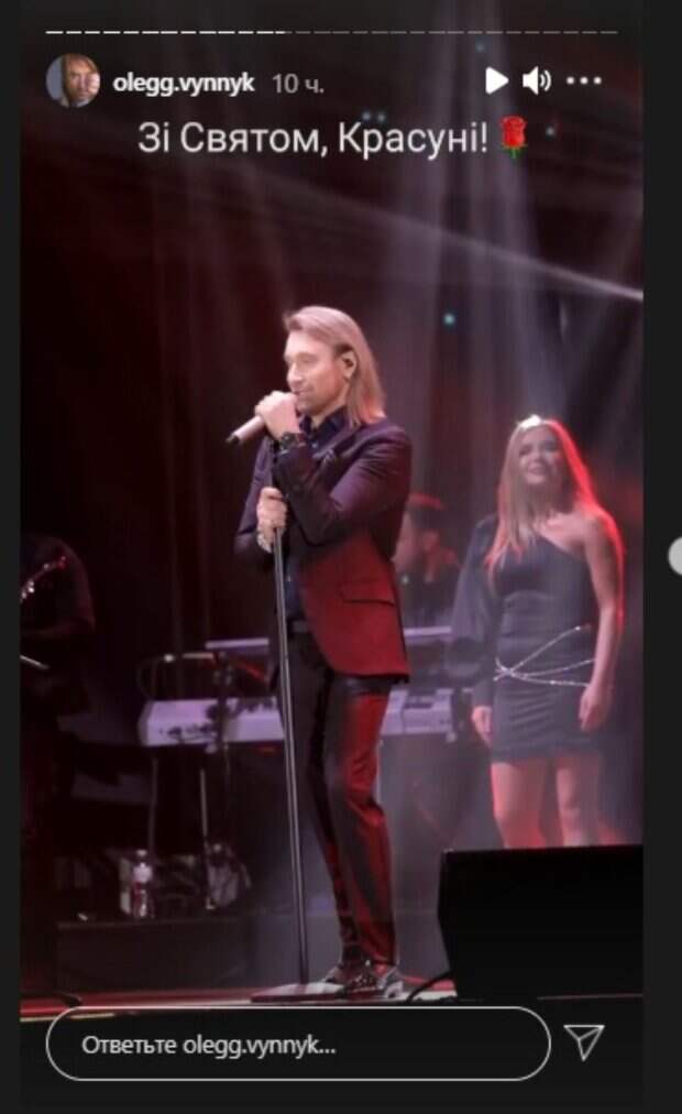 Певец Олег Винник ошеломил трогательным жестом - буря эмоций Как передает Politeka.net, 47-летний артист опубликовал свежие кадры в "сториз" у себя в Инстаграм, на которых показал любопытный момент во время своего выступления в Броварах. Винник "взорвал" сцену душевными песнями, а помогла ему в этом его несменная бэк-вокалистка Таисия Сватко, известная как Таюне.