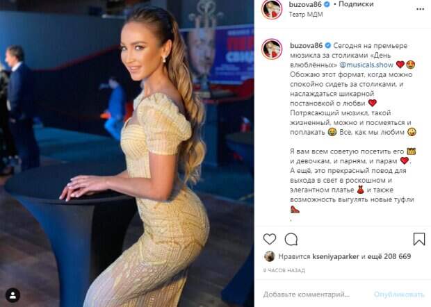 Девушка продемонстрировала с самого удачного ракурса все свои нежные изгибы и округлости. Волосы красотка собрала на затылке, рассыпав длинные локоны по спине. Ольга игриво улыбнулась, "стрельнув" глазками. "Сегодня на премьере мюзикла за столиками «День влюблённых» @musicals.show ❤️