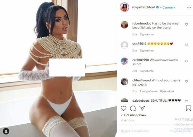 Смелый мейкап и будоражащий взгляд добавили фото особого шарма, который заставил мужчин не только краснеть. Об этом пишет Politeka.net со ссылкой на страничку знаменитости. Фанаты поставили более 50 тысяч лайков и написали комментарии: "Goddess", "Богиня", "Это ангел спустился с небес, лол", "Настоящая жемчужина", "Ты просто потрясающая", "Ничего себе, Эбигейл, ты определенно самая красивая женщина в этой вселенной", "Люблю, ты такая красивая", "Красивое лицо, красивое ожерелье, руки вверх", "Ты идеальна", "Perfect", "Невероятно великолепна, я люблю твои великолепные глаза, они бриллианты". Сообщалось, что американская модель Эбигейл Рэтчфорд покрасовалась перед поклонниками роскошными изгибами без верха. «Перламутровый свет», — коротко говорится в сообщении. Обратим внимание, что на снимке Рэтчфорд позирует в крохотном бикини без лифчика. Пикантные места знаменитость решила прикрыть при помощи бус, придерживая их руками. Напомним, Эби Рэтчфорд покорила необъятными формами в прозрачной сеточке А еще Politeka писала, что соблазнительная Эби Рэтчфорд устроилась на кровати в кружевном белье и чулках Также Politeka сообщала, что неугомонная Эби Рэтчфорд утолила свою страсть прямо в бассейне