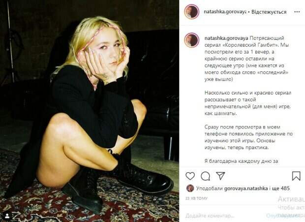 Приемная дочь украинского продюсера Алексея Потапенко Наташа Горовая впечатлила роскошной фигурой, умостившись на полу Как рассказывает Politeka, снимком знаменитость поделилась у себя на странице в Instagram. «Потрясающий сериал «Королевский Гамбит». Мы посмотрели его за 1 вечер, а крайнюю серию оставили на следующее утро (мне кажется из моего обихода слово «последний» уже вышло).