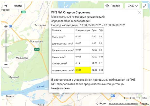 метр. В норме этот показатель не должен превышать 0,05 мг/куб.метр. скриншот Данные представлены за период наблюдения с 13:00 5 августа по 07:00 6 августа. За этот же отрезок времени в Казани повышенную концентрацию формальдегида в воздухе зарегистрировали сразу три станции мониторинга.
