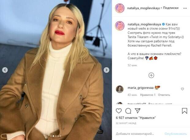 Известная украинская певица Наталья Могилевская похвалилась новыми осенними образами Как сообщает Politeka со ссылкой на Инстаграм певицы, Наталья выложила в соцсети студийные фото, на которых она одета в белоснежный пуловер и осеннее пальто горчичного цвета. Обращает на себя внимание яркий цвет помады, которой Могилевская накрасила свои чувственные губы.