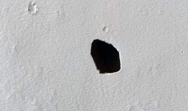 Орбитальный аппарат НАСА Mars Reconnaissance Orbiter обнаружил с помощью камеры HiRise на поверхности Марса загадочное глубокое отверстие (на фото оно выглядит как черное пятно) диаметром 180 метров.
