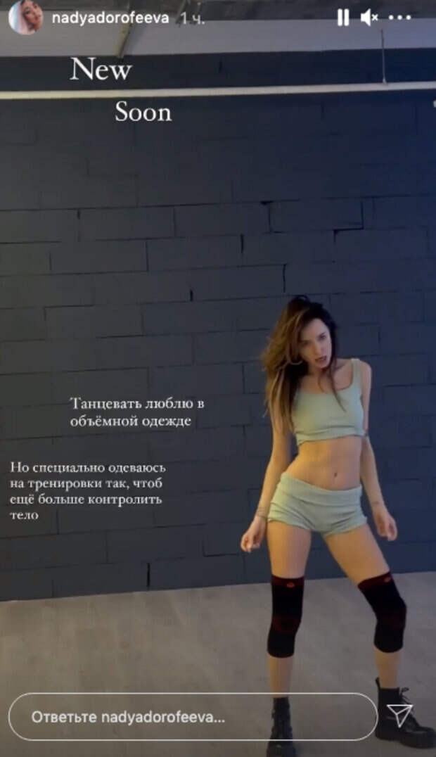 Девушка активно ведет социальные сети и показывает поклонникам моменты из жизни. На этот раз Надя поделилась новой публикацией на своей странице в Инстаграм. На кадрах певица показала, что вернулась к тренировкам. Она позирует перед зеркалом выполняя пластичные движения. На ней короткие серые шортики и спортивный топ того же цвета, комплект отлично показывает идеальную фигуру артистки. Также она объясняет, почему в таком открытом образе тренируется, хоть и любит объемную одежду. "Скоро новое. Люблю танцевать в объемной одежде. Но специально одеваюсь на тренировки так, чтобы больше контролировать своё тело", - рассказала Надя Дорофеева. Реакций и комментариев под публикацией нет, поскольку формат Сториз этого не предусматривает. Ранее сообщалось, Дорофеева в купальнике похвасталась фигурой с выгодного ракурса: "Это фото заряжено на..." Также, Дорофеева сверкнула ножками в непривычном образе, заговорив о своем стиле: "Сегодня не смогла удержаться" Politeka рассказывала, муж Дорофеевой Дантес с маской на лице и в халате рассмешил Сеть: "Надо было еще ноги побрить"