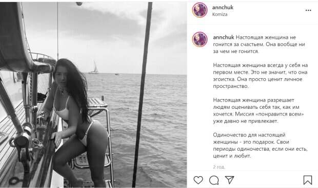 Так, на этот раз Андрийчук порадовала поклонников фотографией в купальнике, которую сделала на яхте вблизи хорватского города Комижа. К тому же, Андрийчук написала философский пост, в котором поделилась с фанатами размышлениями об одиночестве для женщины. "Настоящая женщина позволяет людям оценивать себя так, как им хочется. Миссия "понравится всем" уже давно не привлекает. Одиночество для настоящей женщины - это подарок. Свои периоды одиночества, если они есть, ценит и любит", - размышляет Андрийчук. Поклонники поддержали ее в комментариях. "Золотые слова