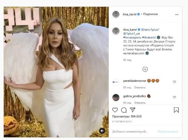 Тина Кароль, Настя Каменских, Даша Астафьева и другие звезды показали себя в ангельских образах На первом фото можно увидеть Тину Кароль. Девушка была в белом платье с вырезами и большими белыми крылышками. Красотка в таком образе позировала на фоне праздничной мишуры. Снимок получился эффектным и светлым.