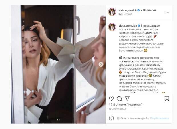 Об этом пишет Politeka.net со ссылкой на страничку знаменитости. "Сегодня я хочу поделиться закулисными моментами, которые случаются всегда, когда хочешь быть идеальным", - написала звезда. "На одном из фотосетов мне показалось, что глаза слишком уж красные и я решила закапать их супер-классными каплями. Аааааа. Не тут то было! Ощущение, будто глаза залили кислотой", - рассказала одну из историй Огневич. "Как сейчас, помню этот концерт во Львове, на мне - красивое платье и всё бы хорошо, только вот платье слишком стягивает грудь, пришлось надеть силиконовые вкладыши. Буквально на середине песни они «отлипают» от тела и..... выпадают! Прямо на сцену, - поделилась историей Злата. "После концерта мне подарили мягкую игрушку, медвежонка. И тут, я замечаю, что из него что-то сыпется.... Вскрываем шов, а там- земля и ещё в ней какая-то записка. Кто интересуется подобными вопросами, поймёт, откуда эта земля", - заключила жуткой историей певица. Фанаты поставили тысячу лайков и написали комментарии: "Истории огонь", "Ого", "Злата, про силикон от души посмеялся", "Ты супер", "Злата, ты невероятная! Будь всегда такой же искренней и доброй!". Напомним, жаркая Огневич забралась на кровать в непристойном платье и показала, на что способна А еще Politeka писала, что Злата Огневич предалась нежности на кровати с бокалом в руках, истинное наслаждение Также Politeka сообщала, что Злата Огневич в кружевном белье сделала любовное признание