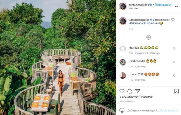 Экс-ВИА Гра и победительница шоу "Танці з зірками" Санта Димопулос разгорячила публику Как передает Politeka.net, 33-летняя звезда опубликовала у себя в микроблоге в Инстаграм фото-воспоминание своего недавнего отдыха на Мальдивах. Девушка блеснула аппетитной фигуркой в черном бикини. Невозможно не налюбоваться ее отменным загаром - словно шоколадка.