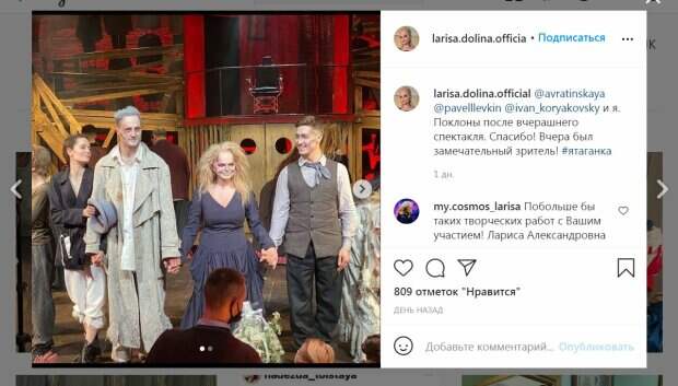На снимках Долину просто невозможно узнать - грим с темными кругами под глазами и бледной кожей, а также необычное платье с красными полосками, напоминающими кровоподтеки. Образ получился пугающим, чего и требовала роль. Вот, что писали пользователи сети: "Я испугалась", "Лариса, Вы прекрасны❤️", "Не ожидала! Страшно!", "Потрясающая миссис Лавет! Браво!!!", "Вау!!! Образ ужасно-прекрасен