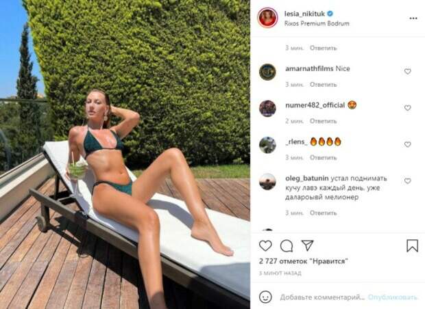 В этот раз в социальной сети Инстаграм Леся показала фигуру в модном маленьким купальнике на завязочках и восхитила пляжным луком в целом. Позируя на шезлонге, звезда соблазнительно выгнулась, демонстрируя длинные ноги. Не обошлось и без комментариев про загар Никитюк, сгоревшей на солнце. «Miss Pantenol 2021