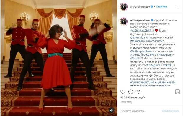 В кадре Пирожков предстал в образе роковой красотки в красном платье с голубым поясом, с пышной грудью, каштановым каре и больших очках в роговой оправе. Дополнили образ красные туфли-лодочки. Вместе с четырмя парнями в костюме сотрудников отеля он танцует на ступеньках. В подписи Александр объявил танцевальный челлендж для поклонников, предложив им выучить движения, снять видео, отметить его тегом и выставить в Инстаграм и ТикТок. Лучших он пообещал «засветить» в своих сториз и сделать героем видео на YouTube-канале, а также подарить им эксклюзивную футболку. Публикацию Пирожков дополнил хэштегами, один из которых особенно интересен: «прабабушкалёгкогоповедения». Отметим, что далеко не всем понравился новый образ Реввы, и многие раскритиковали его за страсть к переодеваниям. «Кроме интима в платье петь нечего?!», «Будь мужиком, кино комедия, одно. Но каждая 3 съёмка одевается, как женщина – это…», «Класс