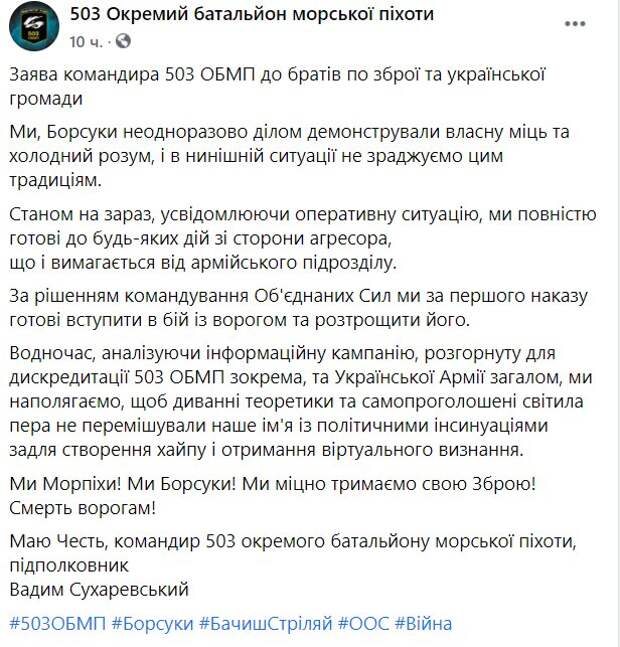 Его заявление было опубликовано на официальной странице 503-го ОБМП в Facebook. "Мы, Барсуки, неоднократно делом демонстрировали собственную мощь и холодный ум, и в нынешней ситуации не изменяем этим традициям. По состоянию на сейчас, осознавая оперативную ситуацию, мы полностью готовы к любым действиям со стороны агрессора, что и требуется от армейского подразделения. По решению Командования Объединенных сил мы при первом приказе готовы вступить в бой с врагом и сокрушить его", – заверил командир морпехов. Кроме того, он подчеркнул, что в последнее время была развернута компания для дискредитации бойцов ВСУ, поэтому он признал "диванных теоретиков" не создавать инсуаций и хайпа в интернете. "Вместе с тем, анализируя информационную кампанию, развернутую для дискредитации 503-го ОБМП в частности, и украинской армии в целом, мы настаиваем, чтобы диванные теоретики и самопровозглашенные светила пера не перемешивали наше имя с политическими инсинуациями и грязью для создания хайпа и получения виртуального признания. Мы – морпехи! Мы – Барсуки! Мы крепко держим свое оружие! Смерть врагам! Имею честь", – подчеркнул Сухаревский. Напомним, ВСУ будут патрулировать Донбасс вместе с оккупантами: новое решение ТКГ возмутило украинцев. Как сообщала Politeka, ЧП на Донбассе: бойцы ВСУ бесследно исчезли на передовой, срочное обращение штаба. Также Politeka писала, что на Донбассе оборвалась жизнь защитника Украины: известны подробности трагедии.