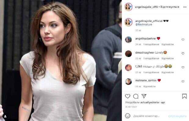 На фан-аккаунтах любят делиться лучшими кадрами Джоли с разными образами. В этот раз поклонники разместили фото Джоли в откровенной футболочке, сквозь которую ясно проглядывались соблазнительные формы без белья знаменитой актрисы. Волосы актрисы распущены и взъерошены, а дерзкий образ дополняют серьги-кольца, которые проглядывают из пышных локонов. В кадре Анджелина смотрит в сторону, и в ее взгляде читается интерес, дерзость и озорство. За короткий отрезок времени, пост собрал тысячи лайков, а колонка комментариев пополнилась словами восхищения, любви и преклонения перед прекрасной актрисой. Фанаты написали: "Она прекрасна!"," Ангел", "Невероятная красота", "Как же она прекрасна", "Я ее обожаю", "Мое сердце у твоих ног", "Красотка", "Люблю!". Ранее мы писали, что многие утверждают, что внешность актрисы – дело рук пластических хирургов, однако сама Джоли не раз говорила, что дело лишь в хорошем уходе за кожей. Напомним, что Анджелина Джоли в черном платье покорила образом, страстный кадр: "Легендарное творение". Портал Politeka рассказывал, как мокрая Анджелина Джоли в мини-бикини заманила в свои сети, покорив хищной красотой: «Дерзкая девчонка». Также на сайте Politeka писали, что Анджелина Джоли сверкнула упругими ягодицами в распутном платье без белья: "Виды восхитительные".