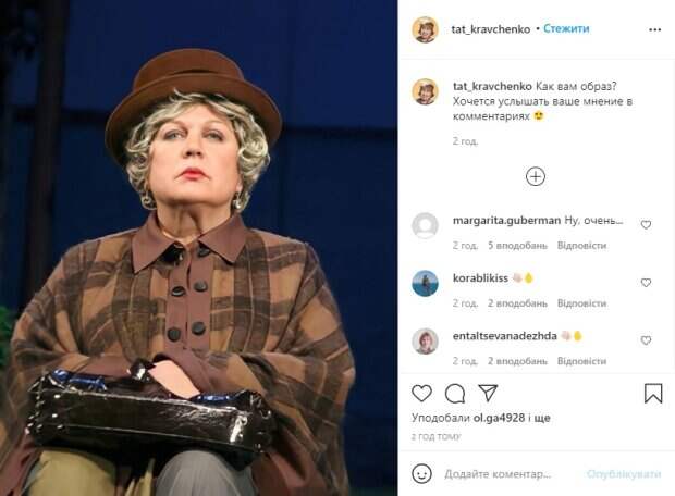 И пока поклонники ждут продолжения сериала, в соцсети Instagram продолжают появляться фан-страницы, посвященные персонажам и сериалу. Так, недавно в одном из таких фан-аккаунтов опубликовали очаровательное фото Татьяны Кравченко, на котором ее просто не узнать. Похоже, это очередное перевоплощение актрисы для роли в театре. На снимке она гордо сидит и сжимает в руках черную сумочку. На сцену Татьяна вышла в серых брюках и темной клетчатой блузе свободного кроя. При этом внимание привлекают светлые волосы артистки, которые она прикрыла кокетливой шляпкой, а на ее лице легкий макияж и уверенный взгляд. В подписи к фотографии говорится: "Как вам образ? Хочется услышать ваше мнение в комментариях". Конечно же пользователи принялись обсуждать новое фото любимой актрисы, отмечая, что здесь она выглядит совершенно иначе и ее сложно узнать. "Прекрасен", "Великолепны", "Вы прекрасны!", "Образ серьезной дамы", "Потрясающе", "Супер", "Любимая актриса! Вы красотка!", "Супер! Татьяна Эдуардовна, любим Вас очень!", "Вы очаровательны!", "Вы настолько прекрасны, Вам любой образ подходит", - пишут в комментариях к фото Кравченко. Напомним, 66-летняя Валюха из "Сватов" поразила обновленным имиджем с распущенными волосами: "Не забывайте, что вы. ..". Как сообщала Politeka, Яркий кадр из сериала "Сваты" наделал шума, все замерли в ожидании нового сезона: "Породнили народ...". Также Politeka писала, Валюху из "Сватов" застали на диване с известным актером: "Как же хочется…".
