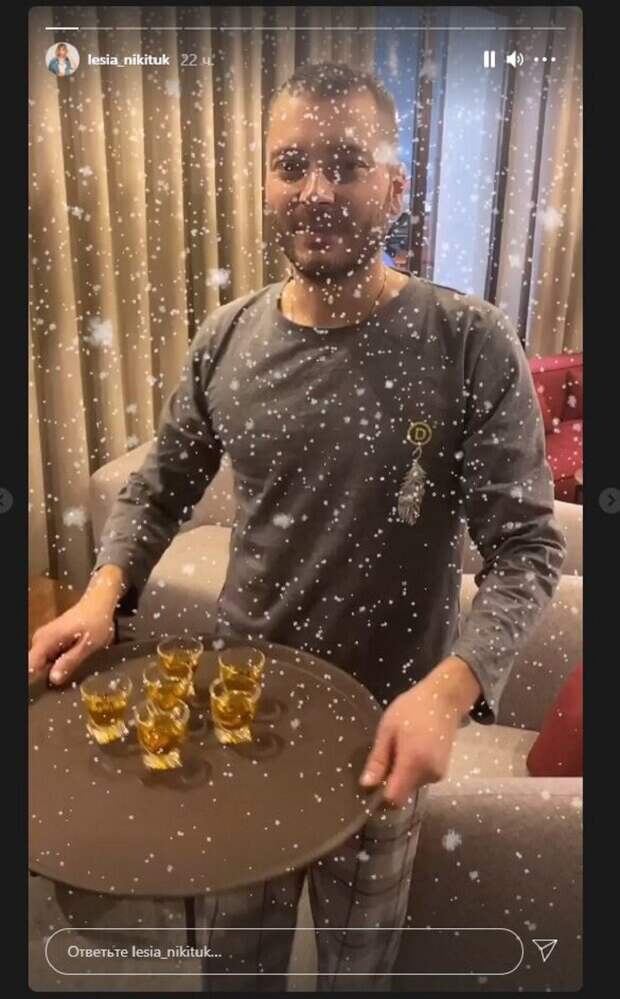 Известная украинская телеведущая Леся Никитюк показала своего друга На кадрах, которые Никитюк опубликовала в сторис, можно увидеть неизвестного мужчину с подносом, на котором стояли рюмки с напитками. Мужчина улыбался и предложил Лесе взять одну, что телеведущая и сделала. Об этом пишет Politeka.net со ссылкой на страничку знаменитости.
