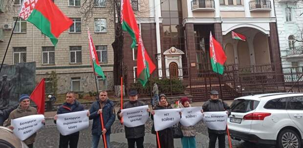 В Киеве несколько десятков белорусов, проживающих на Украине, устроили под посольством Белоруссии митинг. Они обратились к президенту Украины Владимиру Зеленскому с просьбой не нагнетать ситуацию на границе с Белоруссией, передаёт корреспондент «ПолитНавигатора». Люди вышли на акцию с флагами Белоруссии и плакатами «Белорусы и украинцы братья», «Нет войне», «Белорусы и украинцы за мир».