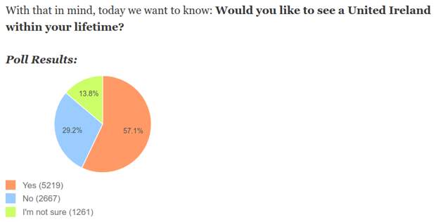 На митинг пришли около 5 тыс. человек. На вопрос газеты «Хотели бы вы увидеть объединенную Ирландию до конца своей жизни» было получено свыше 9 тыс. ответов. На момент написания материала ответы разделились следующим образом: 57,1% (5219 голосов) за объединение, 29,2% (2667 голосов) — против и 13,8% (1261 голос) — не определились. Напомним, на митинге выступил актер, выходец из протестантско-юнионистской среды Джимми Несбитт. Он заявил, что многие его товарищи с интересом относятся к идее объединения, но этому решению должно предшествовать обсуждение конституции объединенного государства.