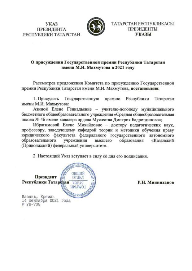 Стали известны имена обладателей государственной премии РТ имени М.И. Махмутова в 2021 году. Указ о ее присуждении подписал президент Татарстана Рустам Минниханов. Лауреатами государственной премии РТ имени Махмутова стали: учитель-логопед СОШ №46 им. кавалера ордена Мужества Дмитрия Бадретдинова Елена Азина; доктору педагогических наук, профессору, заведующему кафедрой теории и методики обучения праву юридического факультета КФУ Елене Ибрагимовой.
