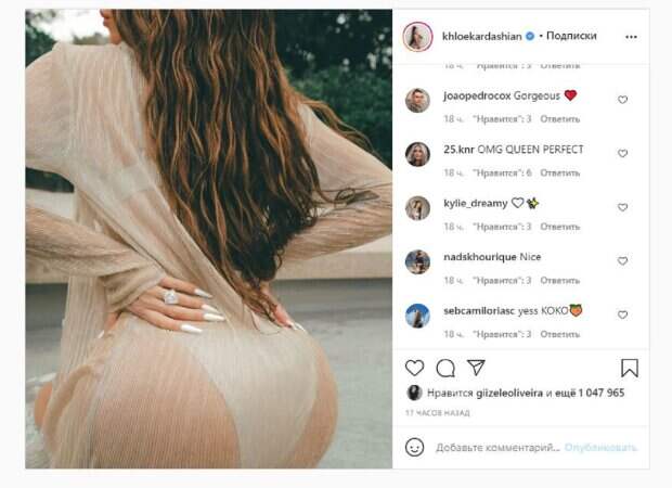 Известная модель Хлои Кардашьян показала себя в пикантном ракурсе На фото Хлои показалась в нижнем белье и прозрачном наряде, который накинула сверху. Звезда развернулась спиной, акцентировав внимание на ягодицах, которые заняли приличную часть кадра. Хлои с удовольствием хвасталась идеальными полушариями, а также большим кольцом на безымянном пальце.