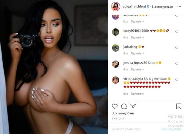 Уточним, что на фотографии Рэтчфорд предстает перед фанатами в мини-бикини белого цвета, которое едва вмещается в кадр. Кроме того, модель решила показаться без верха, прикрыв внушительные объемы рукой. «Очень красиво выглядишь», «наслажденье наблюдать за тобой», «невероятная», «очень круто! Это пожар», «ты знаешь, что очень милая?», «я хочу больше друзей – будешь одним из них», «слишком горячо выглядишь», - пишут ее поклонники. Как мы рассказывали ранее, Эбигейл Рэтчфорд соблазнила фанатов новым чувственным образом в одном кружеве. Так, модель уже несколько лет сотрудничает с мужскими журналами, снимается для популярных глянцев и дает интервью, параллельно занимаясь рекламой белья и не только. Красотка явно без стеснения демонстрирует достоинства тела, благодаря чему Рэтчфорд достаточно быстро удалось "покорить" Instagram. Напомним, что Эби Рэтчфорд обтянулась красной сеточкой и превратилась в настоящую госпожу. А еще Politeka писала, что бесстыжая Эби Рэтчфорд показала достоинства в дерзкой позе. Также Politeka сообщала, что Эби Рэтчфорд посветила ягодицами в "хищном" боди.
