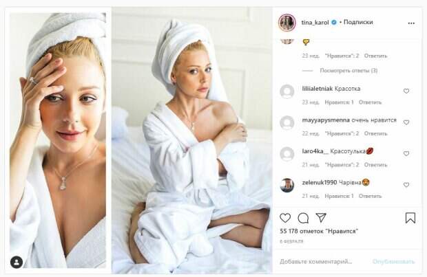Тина Кароль, Оля Полякова, Настя Каменских и другие звезды показались в смелых образах На первом фото Тина Кароль. Красотка позировала в халате и белом полотенце на голове. Звезда сидела на кровати и демонстрировала свою идеальную красоту. Певица, как можно заметить, уже нанесла макияж на лицо. Об этом пишет Politeka.