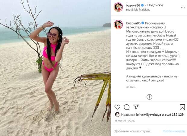 "Рассказываю увлекательную историю. Мы специально день до Нового года не загорали, чтобы в Новый год не быть с красными лицами. Думали, встретим Новый год и начнем отдыхать. И с ночи как ливонуло. Мораль - не жди завтра! Вот и первый урок 1 января! Живи здесь и сейчас! Кайфуйте! Даже под проливным дождем", - написала она. Также певица акцентировала на том, что взяла на отдых огромное количество купальников. "А подсчет купальников - никто не отменял... Какой это уже?" - спросила она у фолловеров. В комментариях фолловеры поздравили Бузову с Новым годом, а также выразили восхищение ее фигурой. Впрочем, были и те, кто утверждал, что российская певица слишком худая. "Оля, с Новым годом", "Это уже 4, или я ошибаюсь?", "Оленька, ты просто супер", "Оля, поешь хлеба хоть немного. Худая - жуть", - пишут в комментариях. Напомним, счастливая Бузова не сдержала эмоций, запрыгнув на руки к звездному красавцу Как Politeka писала, что скандальная Бузова рухнула лицом вниз и не смогла подняться, появилось видео Также Politeka сообщала, что высокомерная Ольга Бузова объяснилась после истерики на шоу