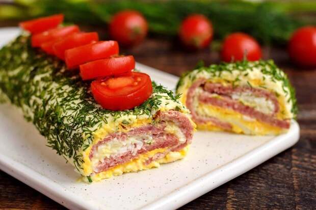 Оригинальные закуски всегда пользовались спросом на праздничном столе. Предлагаем интересный рецепт рулета из плавленого сыра. В качестве начинки используем копченую колбасу и яйца, разделяя белки от желтков, чтобы слои получились красивей. Если рулет нарезать на порционные куски, получатся роллы, которые очень аппетитно смотрятся в разрезе.