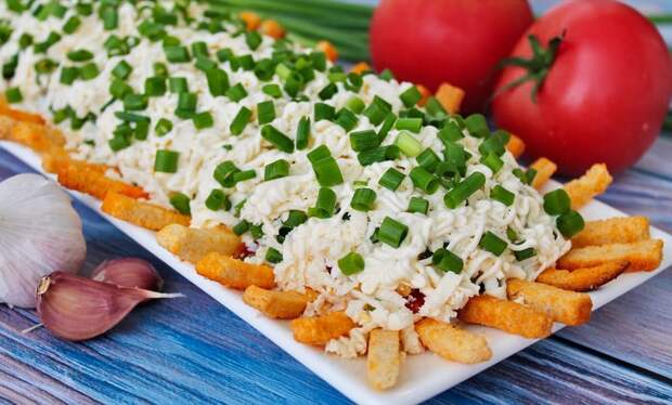 Сверху натереть чеснок и поперчить. На крупной терке натереть яйца, смазать майонезом и посыпать луком (половину оставить для украшения). Натереть плавленый сырок. По бокам выложить сухарики, полить майонезом и посыпать луком. Салат готов![embed][/embed]