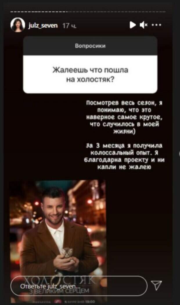 Все эфиры именно она считалась фавориткой, и ей пророчили победу. Когда выиграла Анна Богдан, поднялась волна хейта не только в сторону победительницы, но и Михаила. Сейчас Юлия пережила произошедшее и даже заявила, что попробует себя в новой роли. Она сообщила, что снялась в эпизоде популярного украинского сериала "Крепостная", в котором одну из ключевых ролей сыграла Ксения Мишина - главная героиня первого сезона проекта "Холостячка": «✔️Я смотрела все серии т/с “Крепостная”. Очень понравилась героиня Лидия Шефер в исполнении @misha.k.ua . Она просто бесподобна
