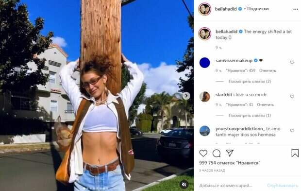 Длина одежды была настолько смелой, что едва ли скрывала красивые места. Знаменитость похвасталась упругим животиком и тонкой талией. Сверху топика знаменитость надела рубашку. Она надела джинсы, севшие чуть выше ее бедер. Разные украшения дополнили образ. В одном из кадров знаменитость предстала за столиком кафе. На тарелке возле нее лежали хорошо поджаренные, толстые тосты. Модель откинулась на спинку стула и вытерла платочком губы. На другом - модель забралась на лестницу и раскинула руки к верху. "Энергия сегодня немного сместилась