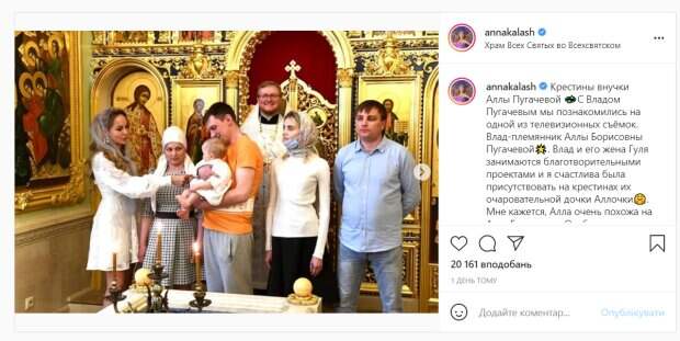 На своей странице в Instagram она рассказала, что племянник Примадонны Влад крестил дочь. Актриса пояснила, что познакомилась с племянником Примадонны на съемках. Родители малышки пригласили Калашникову в храм вместе с крестными родителями девочки. "Крестины внучки Аллы Пугачевой