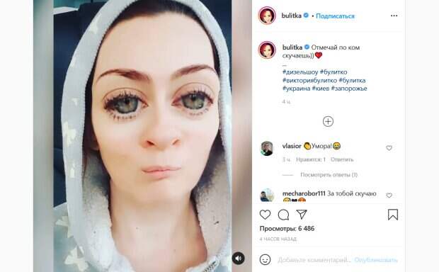 Так, юмористка удивила зрителей новыми чертами лица: огромными округлившимися глазами, большим носом и крошечным ртом. Для достижения такого эффекта Виктория явно использовала специальную маску Инстаграм. «Скучала по тебе, мой сладенький», - произносит Булитко на видео неестественным голосом. В подписи к кадрам она предложила своим поклонникам отмечать в комментариях людей, по которым они скучают. Фанаты артистки не смогли пройти мимо такого поста. «Умора!», «За тобой скучаю», «Чуть икотка не напала», «а глаза такие... Маленькие-маленькие», «Моя мама такая же», «Вика! Ты и в таком образе-прелесть!», «По новым выпускам Дизель шоу с твоим участием», «Ой, юмор обожаю, гастролей вам хороших», «Ваааууу это ты так приготовилась на лето...Викуся вау! Ужасно привлекательная», «Приветик. Викуля вы всегда на высоте, восхищаюсь вами. Ровной вам дороги по жизни», «Вот это глазища от того что продлили Карантин аж до лета», «Инопланетный гость», - пишут люди. Напомним, Булитко из «Дизель шоу» решилась на обнаженку ради роли в кино: «Ух, какой крутой…». Как сообщала Politeka, Булитко из "Дизель шоу" избавилась от одежды и показала, как получает удовольствие в конце дня: "Займусь любимым делом". Также Politeka писала, что звезда "Дизель шоу" Булитко переборщила с увеличением глаз, любимицу публики не узнать: "Сейчас выползут...".