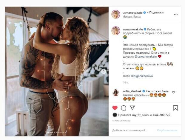 Известная фитнес-тренер и модель Екатерина Усманова показала себя и рассказала о проблеме На фото Усманова позирует в коротеньких шортиках и топе. Красотка обнимает своего мужа, который стоял в штанах и с голым торсом. Парочка целовалась, пока в руках держала новогодние огни. На еще одном фото Екатерина наклонилась, развернувшись спиной.