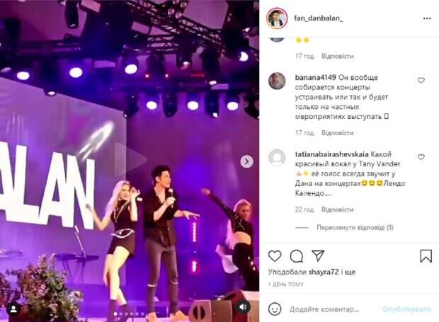 Сообщается, что выступал Дан на вечеринке в Киеве 9 июня, оттуда и эти видео. На кадрах видно, что молдавский мачо здорово зажег публику своим живым концертом. На сцену он вышел не только в сопровождении музыкантов, но и нескольких девочек из подтанцовки. Правда, и в комментариях пользователи раскритиковали. Как и самого Балана – фанаты недовольны, что артист уже давно не дает концертов для всех, а выступает только на корпоративах и зарытых мероприятиях. В подписи к публикации говорится: "Видео с выступления Дана на мероприятии в Киеве 09/06". Пользователи тут же принялись обсуждать ролики с выступления Балана. "Это был концерт или какое-то мероприятие?", "Мероприятие", "Чем такая подтанцовка, лучше без неё", "Ну и подтанцовка, кто во что горазд. А пел, как всегда, хорошо", "А по Дану видно, когда он на концерте – зажигалка, или как здесь вышел, быстренько пропел и уехал", "Красавчик", "Кому-то повезло, Дана увидели", "Он вообще собирается концерты устраивать, или так и будет только на частных мероприятиях выступать?", - пишут в комментариях. Напомним, "доказательства" романа Дана Балана и Тины Кароль всплыли в Сети: "Это точно не игра" А еще Politeka писала, Дан Балан, раскрыв, что у них произошло с Кароль, объявил о новом шансе: "Последний романтик. .." Также Politeka сообщала, что мама Дана Балана устроила Кароль сюрприз, внезапно появившись на сцене.
