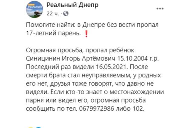 Огромная просьба, пропал ребёнок Синицинин Игорь Артёмович 15.10.2004 г.р. Последний раз видели 16.05.2021", - говорится в сообщении. Также там уточнили, что ребенок стал неуправляемым после смерти брата. Ни у кого из родственников Игорь Синицинин не появлялся. Родные опросили друзей мальчика, но они его тоже давно не видели. 17-летний мальчик имеет светло-карие глаза и каштановые короткостриженные волосы. Всех, кто видел разыскиваемого или кому известна любая информация о возможном его местонахождении, просят срочно сообщить по телефону на спецлинию "102" или по телефону 0679972986. Также ранее сообщалось, что в Запорожской области ищут 16-летнюю Генчевай Карину Витальевну, которая с 19-го мая не выходит на связь со своей матерью. Уточняется, что 16-летняя Карина учится в одном из профессионально-технических лицеев в городе Мелитополь .По данным полиции, девушка может находиться вместе с 16-летним парнем. Напомним, что трагедией закончились поиски 14-летнего Никиты на Одесчине: что известно на данный момент. Как сообщала Politeka, харьковчанин вышел из больницы и бесследно пропал, нуждается в медпомощи. Также Politeka писала, что брошены все силы на поиски 21-летнего парня: отправился в воинскую часть и исчез, фото и приметы.