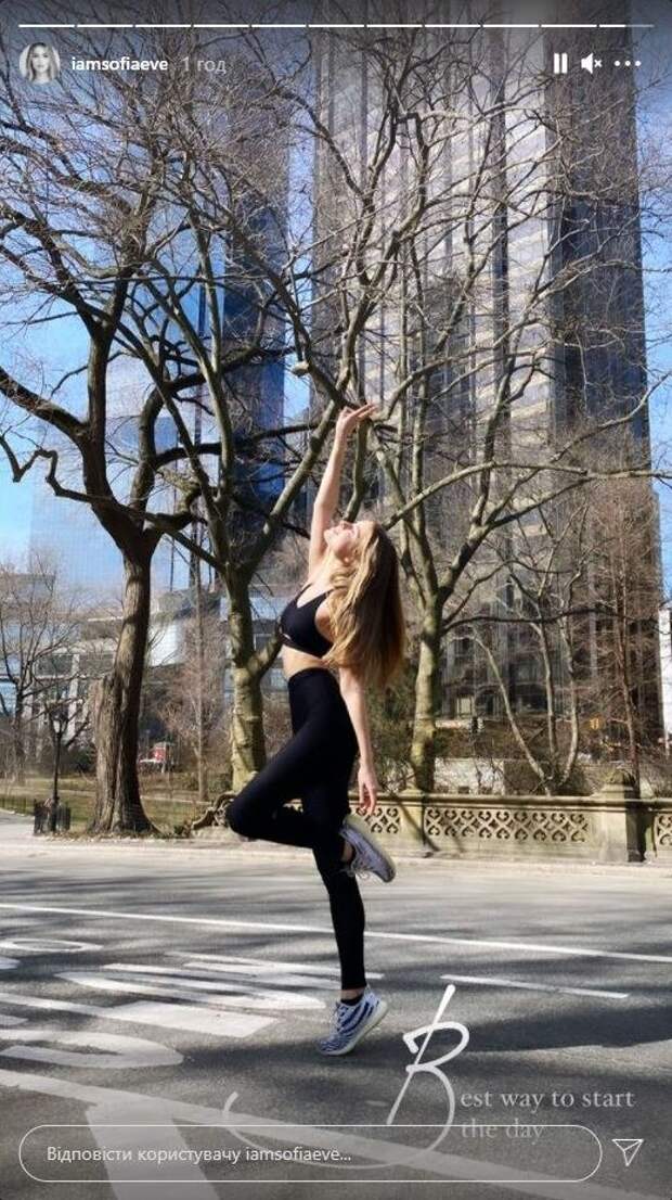 Так, недавно Соня опубликовала в своих Instagram-сторис очаровательный кадр, на котором можно увидеть ее тренировку в самом сердце Нью-Йорка, где она учится и живет. Девушка решила позаниматься на свежем воздухе – она пришла в Центральный парк мегаполиса и подставила тело солнечным лучам. Перед камерой Евдокименко позирует в обтягивающих черных лосинах и коротком спортивном топе, а завершают образ стильные кроссы. Этот наряд красиво подчеркнул идеально стройное тело юной красотки, посодействовала этому и поза – модель как будто тянется к небу. Ее волосы распущены и чуть растрепаны ветерком, а на лице легкий макияж и блаженная улыбка. свой соблазнительный кадр Соня подписала так: "Best way start the day". Напомним, что внучка Ротару произвела фурор роскошной внешностью и раскрыла свой секрет: «Какая же красотка» Как сообщала Politeka, 19-летняя внучка Ротару в крохотном топе провела сеанс соблазнения: "Просыпайтесь...". Также Politeka писала, что 19-летняя внучка Софии Ротару показала, как наслаждается жизнью с женихом-миллионером: фото счастливой парочки.