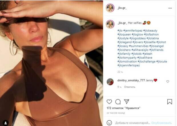 Сама она факт вмешательства косметологов в ее внешний вид называет ложью и подмечает, что залог ее красоты в здоровом образе жизни, бесконечных тренировках и правильном питании. К слову, на отдыхе, во время работы или в поездке рядом с Дженнифер всегда будет стакан воды. Такие термокружки она носит с собой, чтобы постоянно «питать» кожу, как говорит сама звезда. На пляже Лопес с гордостью показывает себя: нежась на солнце, она выглядит вполне естественно и просто без макияжа. Однако даже так, в коричневом купальнике с декольте, Дженнифер кажется моложе своих лет. К слову, загорает Лопес не так часто, боясь, что солнце повлияет на ее кожу и она станет слишком дряблой. Отметим, звезда отказалась от всех напитков, кроме воды и сока, а также регулярно увлажняет кожу и пьет очень много воды. На одном из последних селфи хорошо видно, почему Лопес не смущается показывать и пресс. На пике популярности Дженнифер даже смогла открыть собственный бренд косметики, ведь может утверждать, что благодаря правильному уходу она всегда молода, с этим согласны фанаты: «Превосходная, не оторваться; какая романтика, чудесно; мне очень нравится белый топ; такой живот бы все; О чем я думал? После этого забыл; Вечно красавица, мой ангел; Мне нравится эта фотография jlo xoxo xoxo